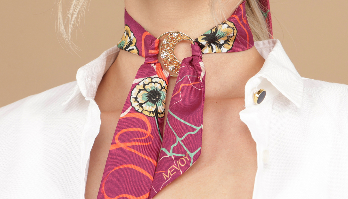 Agganciato a un foulard, a una catena o a un nastro, non fa solo da chiusura: ancora il gesto, lo rende preciso, controllato, quasi progettato.